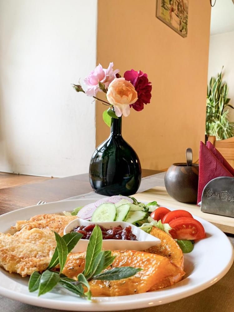 Kafejnīca (līdz 50 vietām) izveidota 18. gadsimtā celtajā kalpu mājā, tās interjēra pamatā ir antīkas senlietas.